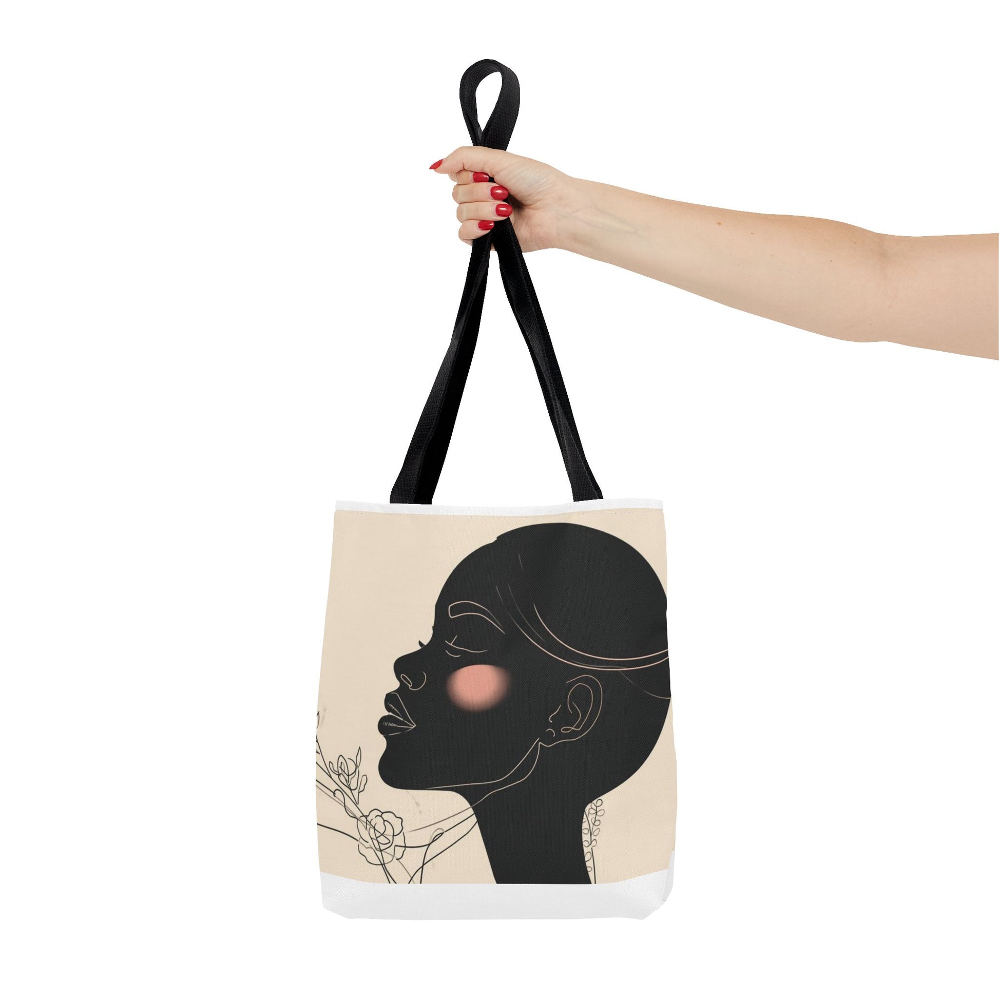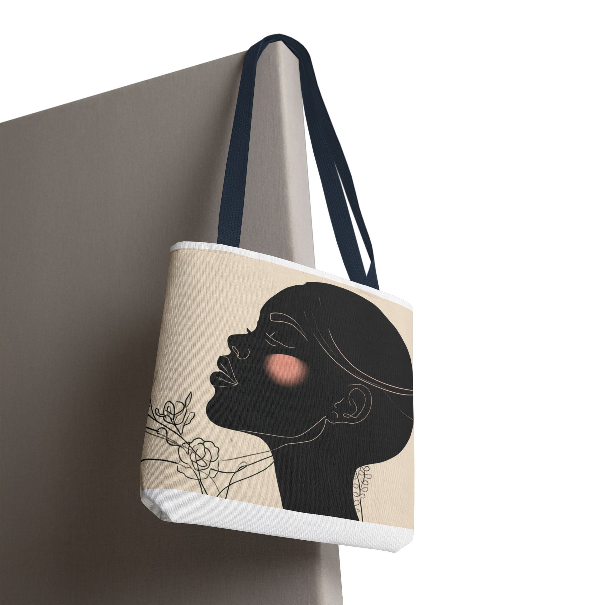 Afro Silhouette Floral Tote Bag — Minimalist Black Woman Profile Canvas Tote
