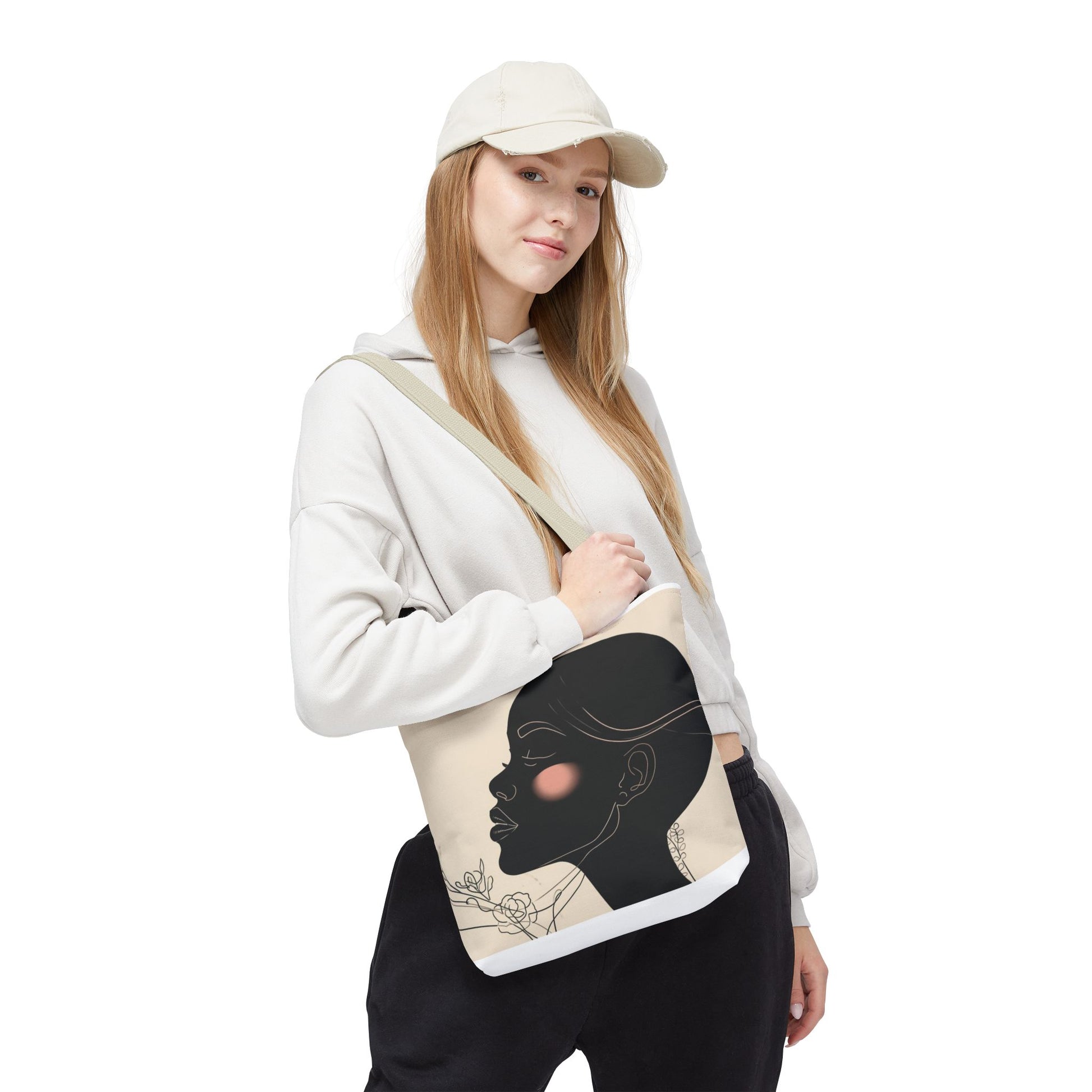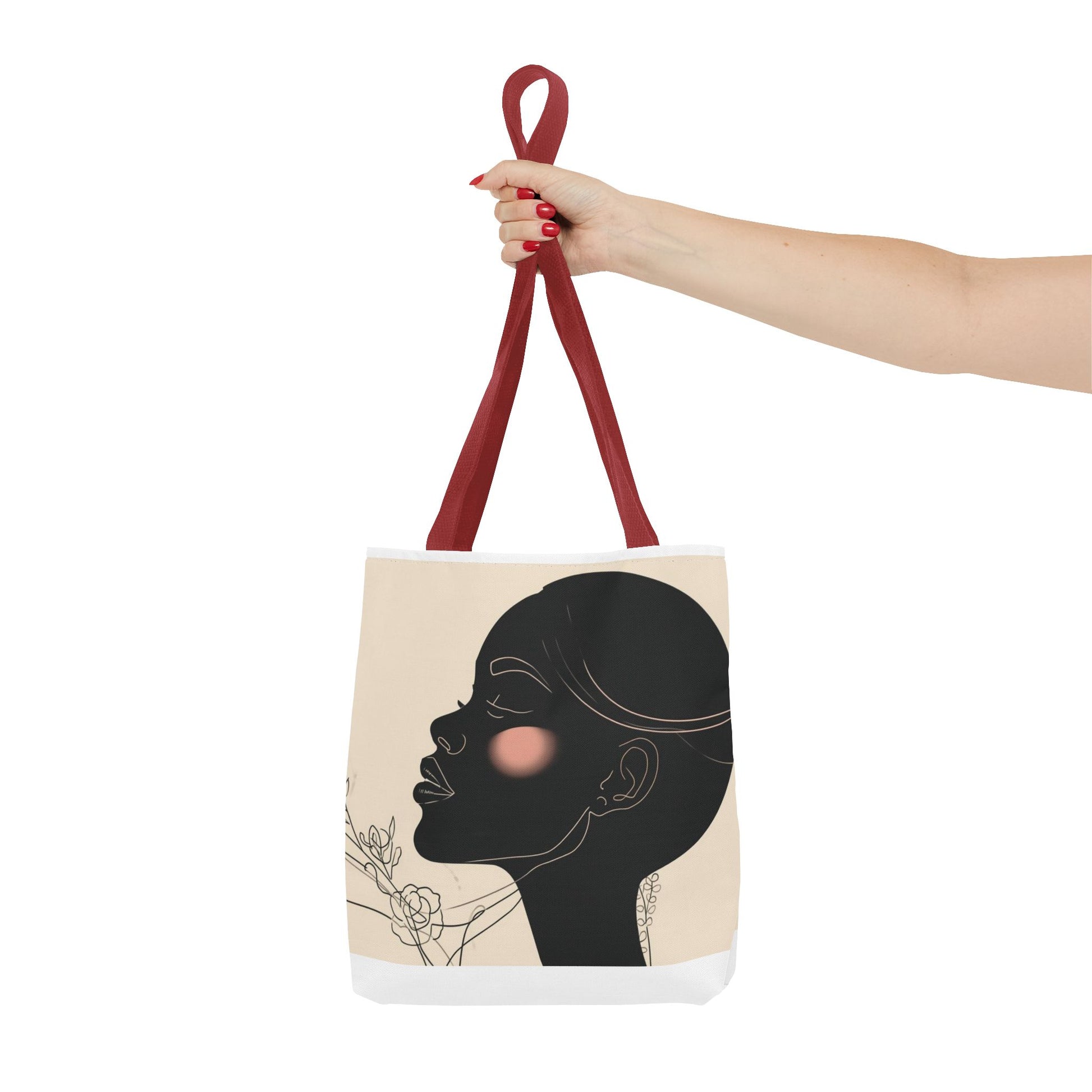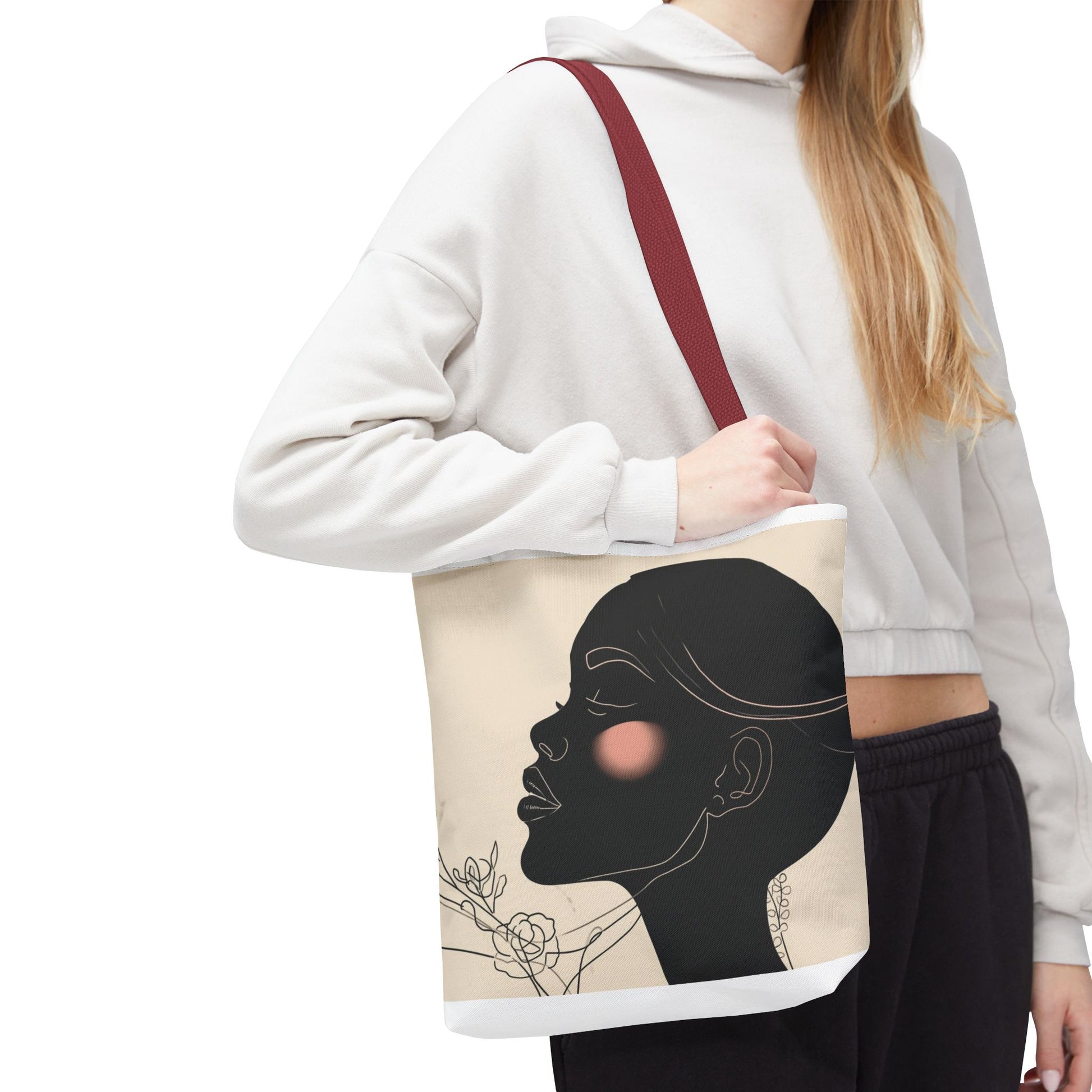 A soft, art-forward tote that carries more than just your things — it carries a mood. The print features a minimalist, profile silhouette of a woman rendered in deep, warm tones against a neutral background, with delicate linework florals and a gentle blush on the cheek. Lightweight yet sturdy 100% polyester body with boxed corners and reinforced handle stitching makes this bag feel dependable for daily errands, studio visits, or carrying a sketchbook and coffee. Choose from five handle colors to match your style; three sizes let you pick compact or roomy. The laminated interior keeps the shape and helps protect contents, while the seamless stitching and clean hems give it a refined, handmade look. It’s a quiet statement piece that complements creative wardrobes and thoughtful city living.