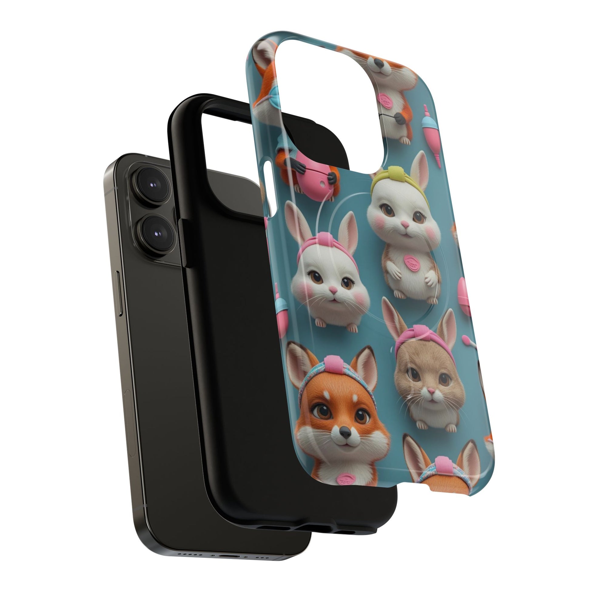 This slim, tough magnetic phone case brings playful charm to everyday protection. Cute 3D-style animal faces float across a soft teal field — bunnies, foxes, and their tiny accessories create a whimsical pattern that brightens your pocket and screen time. The dual-layer construction pairs a rigid polycarbonate shell with a shock-absorbing TPU liner, while the full-wrap print keeps the artwork vivid around every edge. Magnetic compatibility with MagSafe® accessories means easy mounting and wireless charging without removing the case. Choose glossy for a vibrant, reflective finish or matte for a softer, satin look. Lightweight but built to stand up to daily knocks, it fits newer iPhone 17-series models and keeps ports and buttons fully accessible.