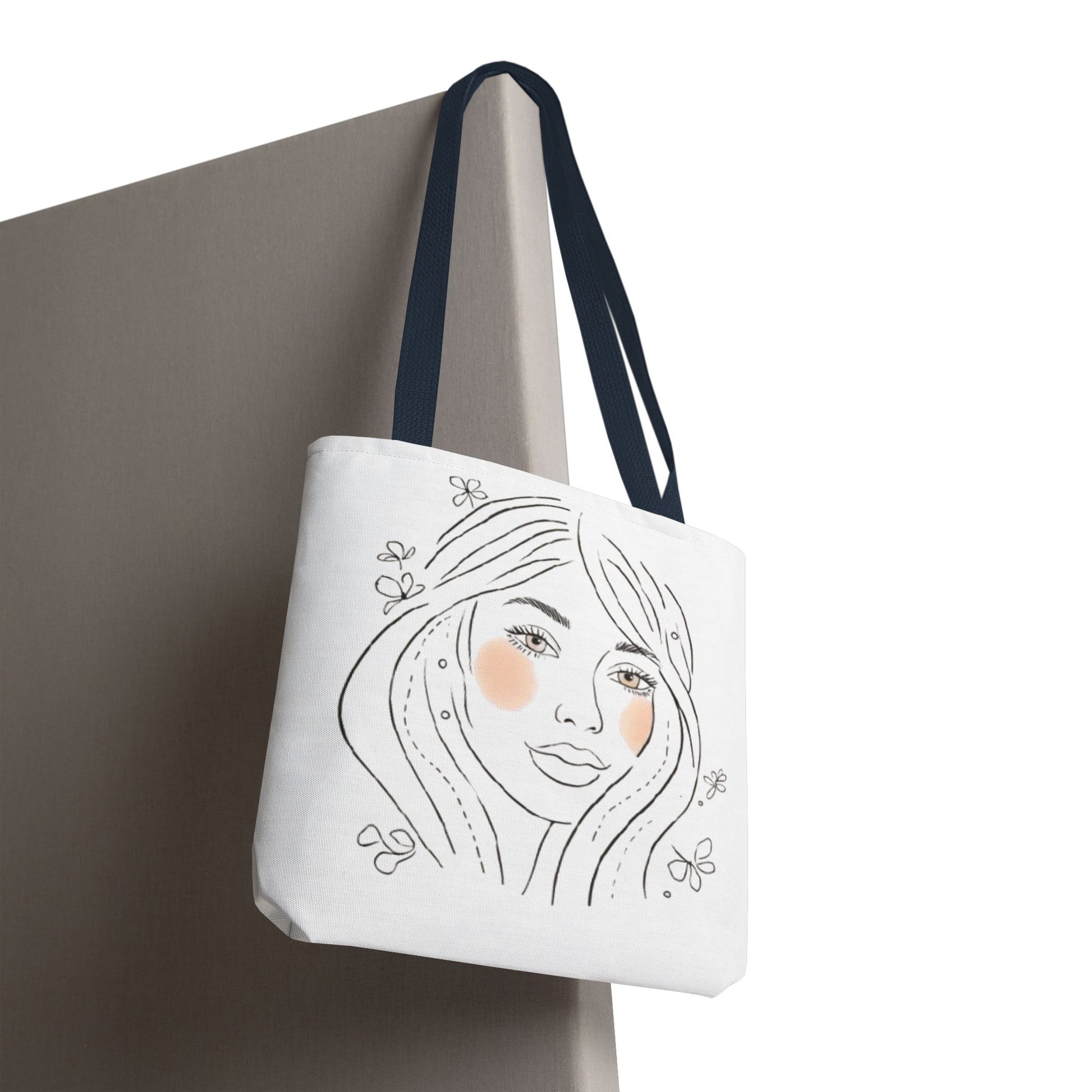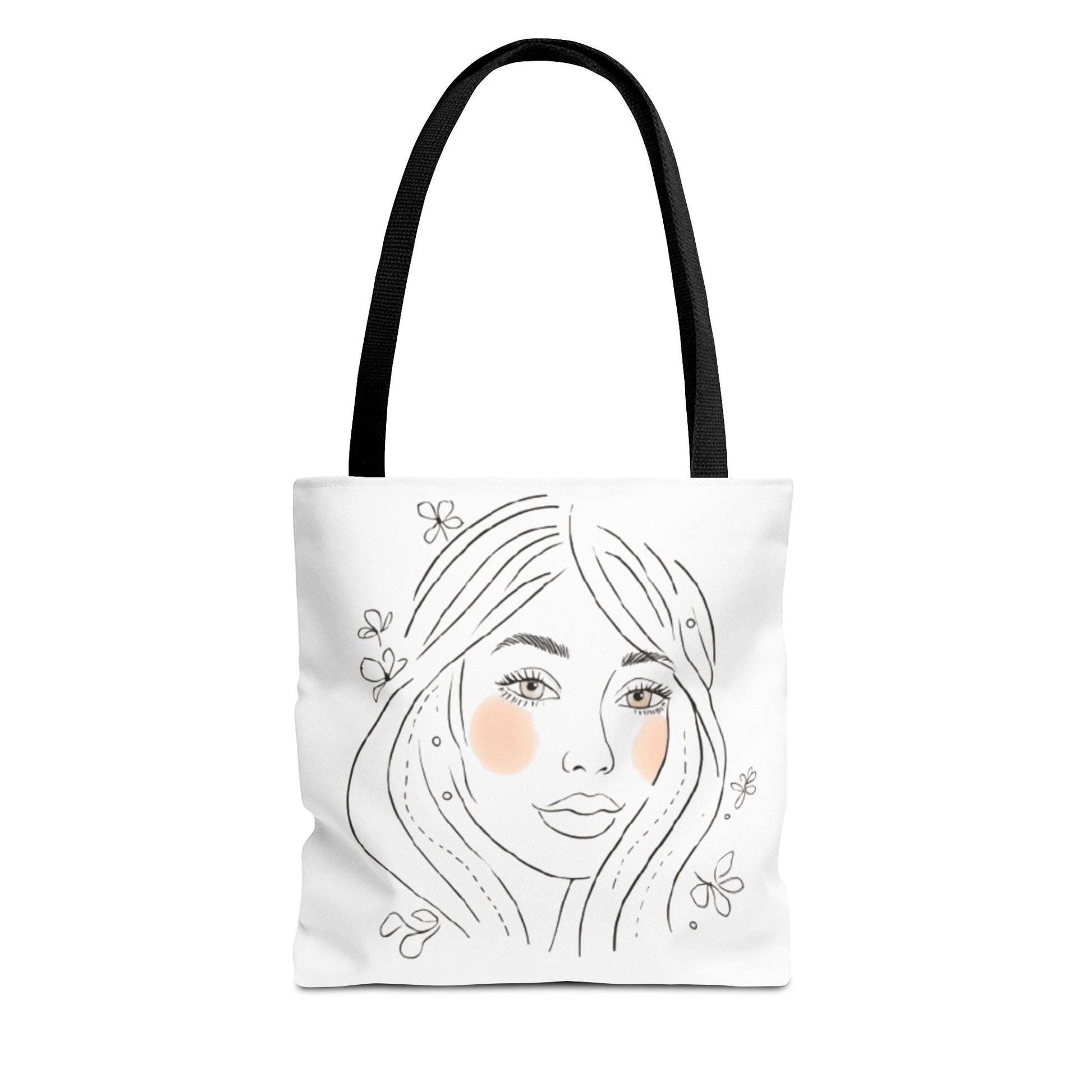 Floral Portrait Tote Bag — Hand-Drawn Woman Face with Blush Cheeks