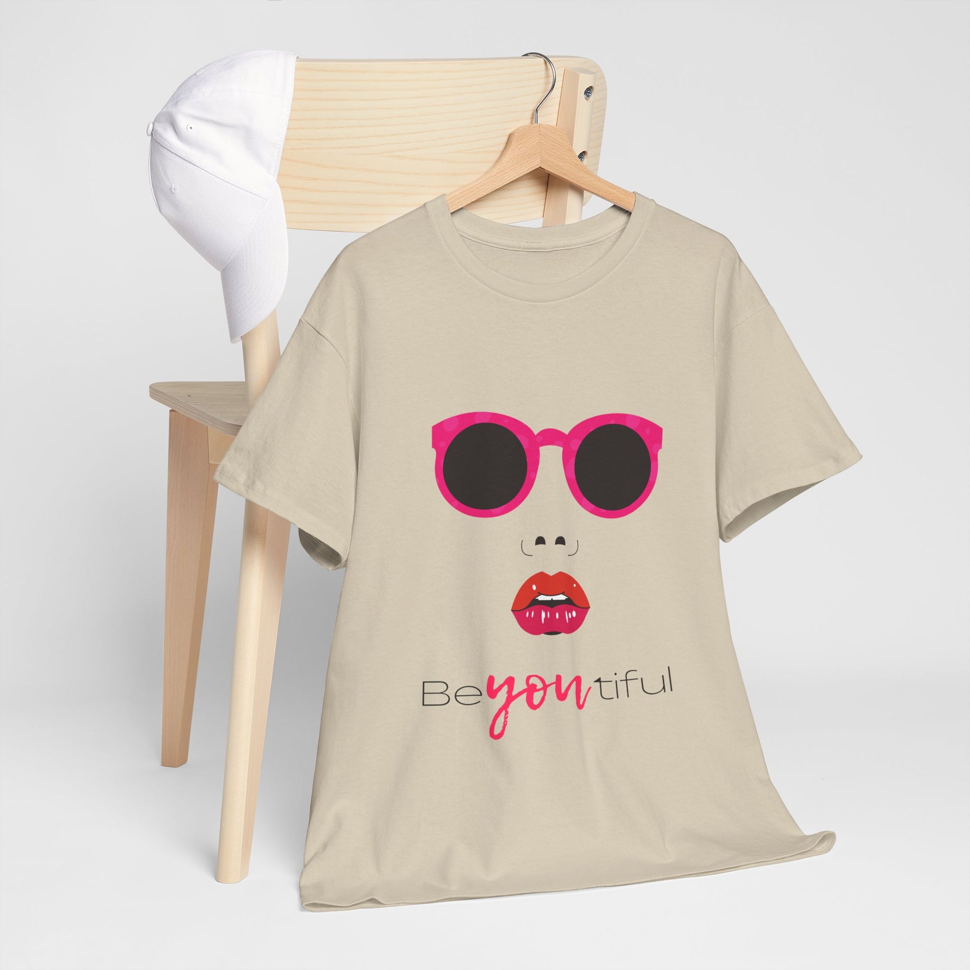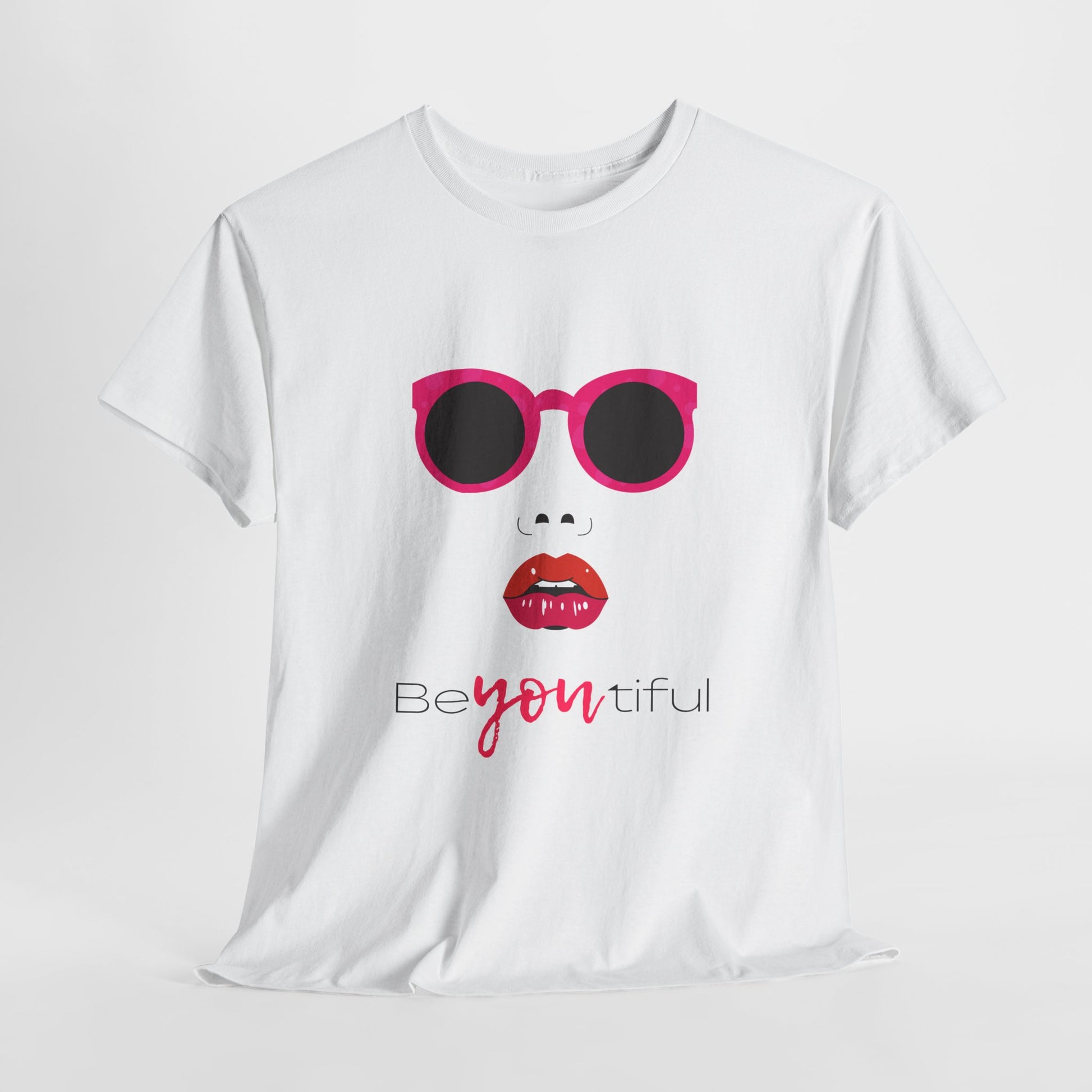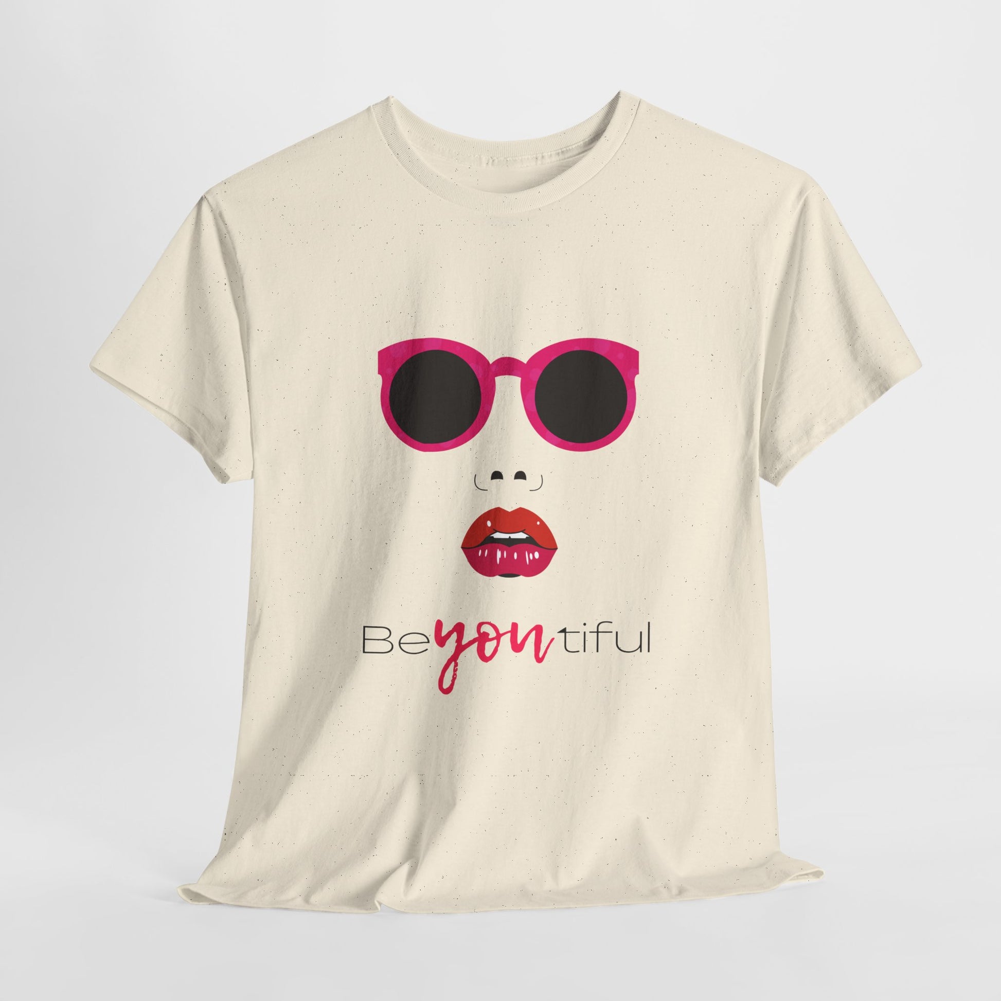 This lightweight cotton tee carries a playful, confident vibe — bright pink sunglasses, bold red lips, and the scripted line 'Be you tiful' that puts the emphasis on being yourself. It sits relaxed on the body and reads like a little manifesto: a casual piece that adds instant personality to jeans, skirts, or layered outfits. Wear it to run errands, meet friends for coffee, or bring it to a creative meetup — it brightens the day without shouting. The soft, smooth face of the fabric makes the printed art pop while staying comfortable against skin. Thoughtful details like a ribbed collar that keeps its shape and a tear-away label for itch-free wear let the design do the talking — confident, cheeky, and effortlessly feminine.